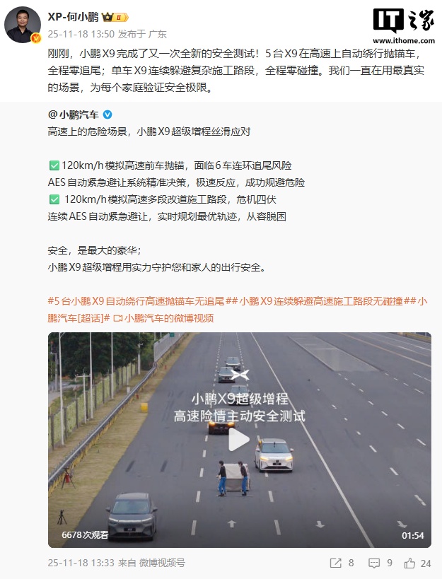 IT之家 11 月 18 日消息,小鹏汽车创始人何小鹏今日宣布股票配资之家,小鹏 X9 超级增程全球首次挑战高速两大高危场景,AES 自动紧急避让全程零失误!